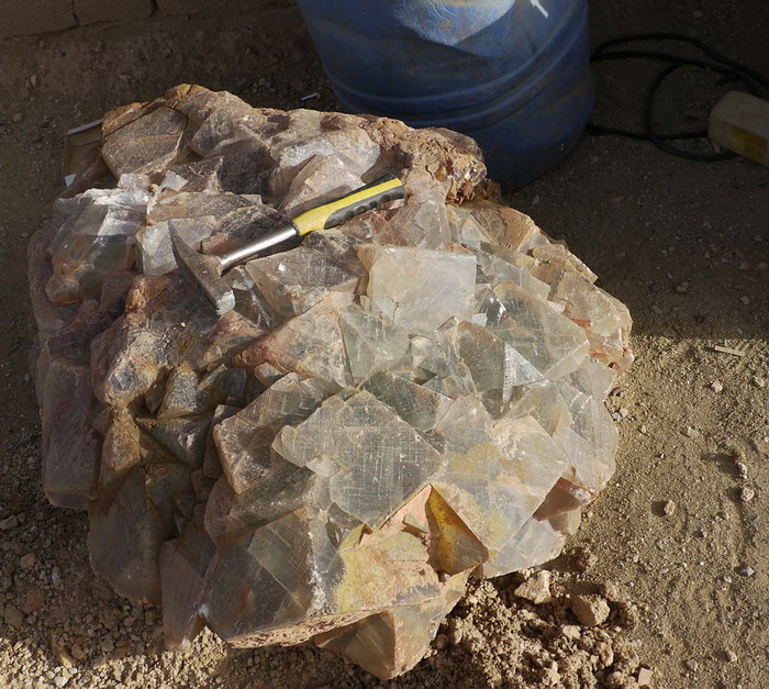 Huge fluorite crystals near entrance to the mine office in Hameda
